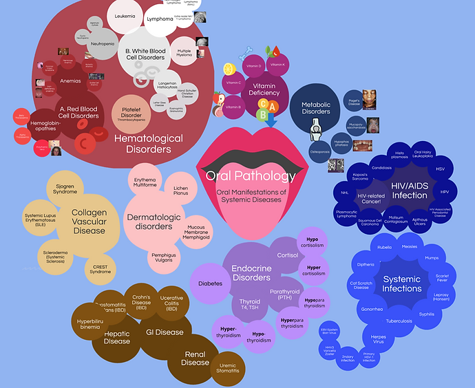 In this study guide, click on each circle to see a summary "one pager" of the disease, symptoms, oral manifestations, treatment. You can zoom in and out as you see fit! Viewing on computer allows to you move between sections most easily